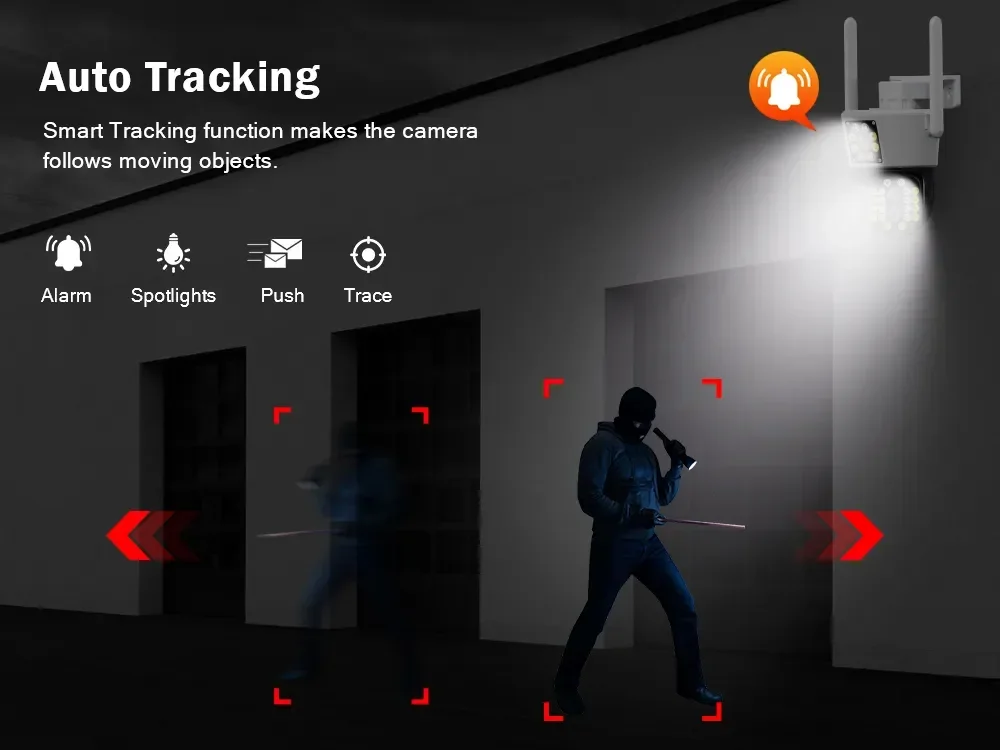 -With advanced AI auto tracking technology, After locking the target, the video camera will adjust the pan/tilt rotation automatically, Tracking moving objects,cars,pets,human. This security camera never let you miss any important moment