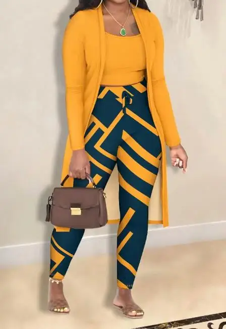 3 Piece Set Women Outfit 2023 Spring Autumn Fashion Stripe Print Long Sleeve Coat & High Waist Drawstring Pants Set with Vest