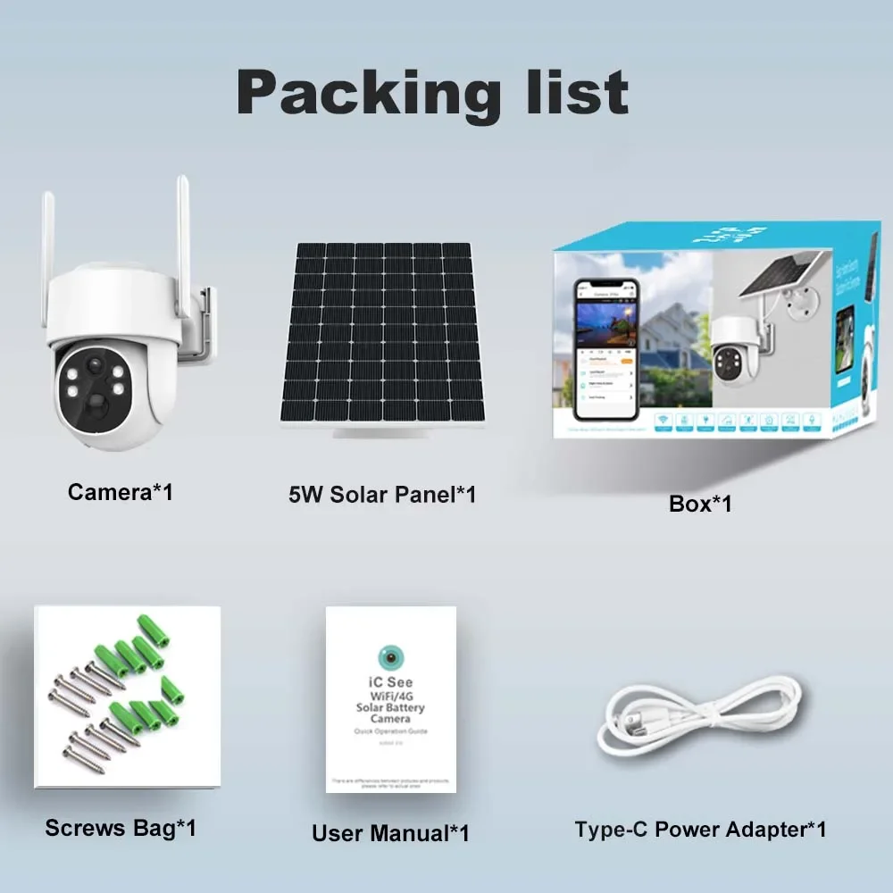 The camera comes with a built-in battery and can be connected to a solar panel for charging and use, allowing for wireless installation