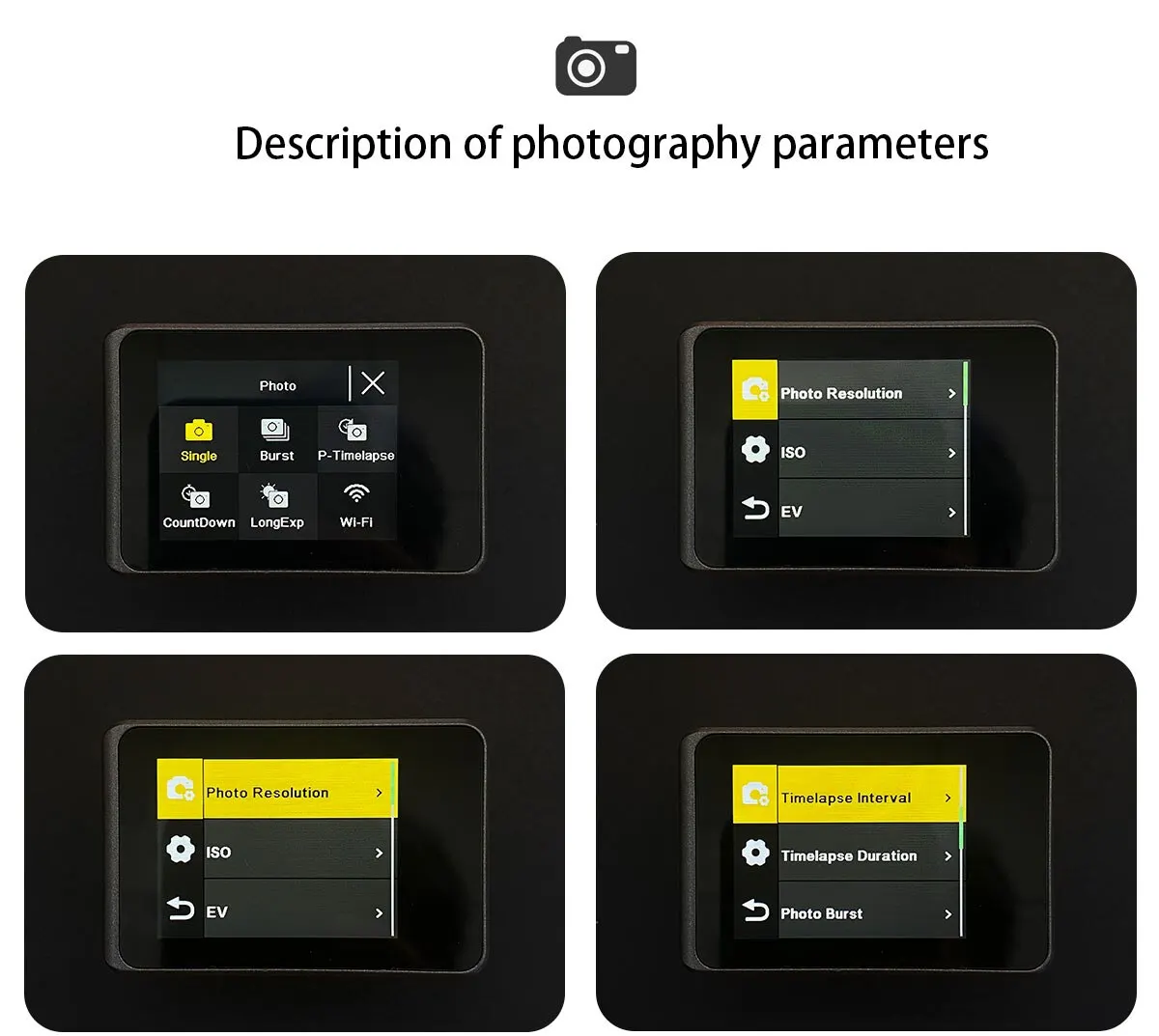 、Fast motion video、Loop video、Support for 1 minute video, 3 minutes, 5 minutes cycle、Picture mode、Single, timing shoot, shoot