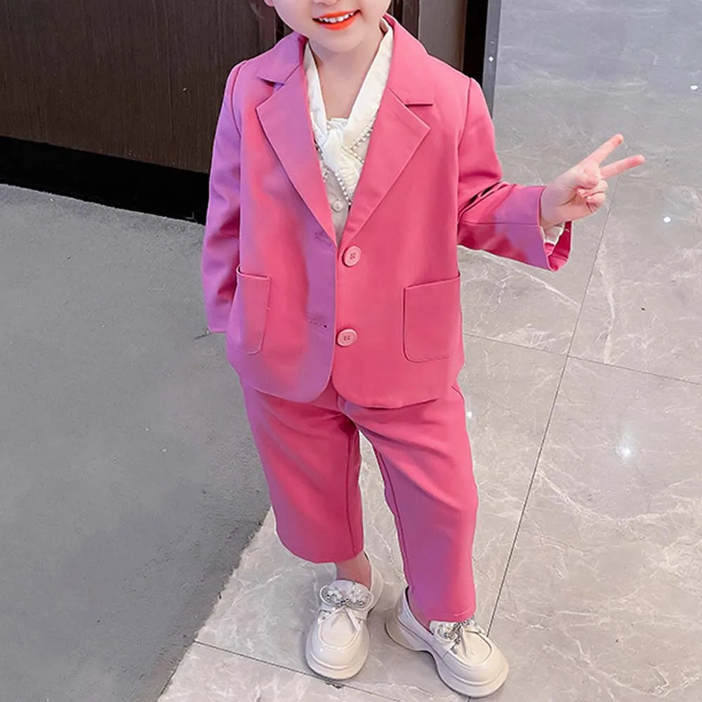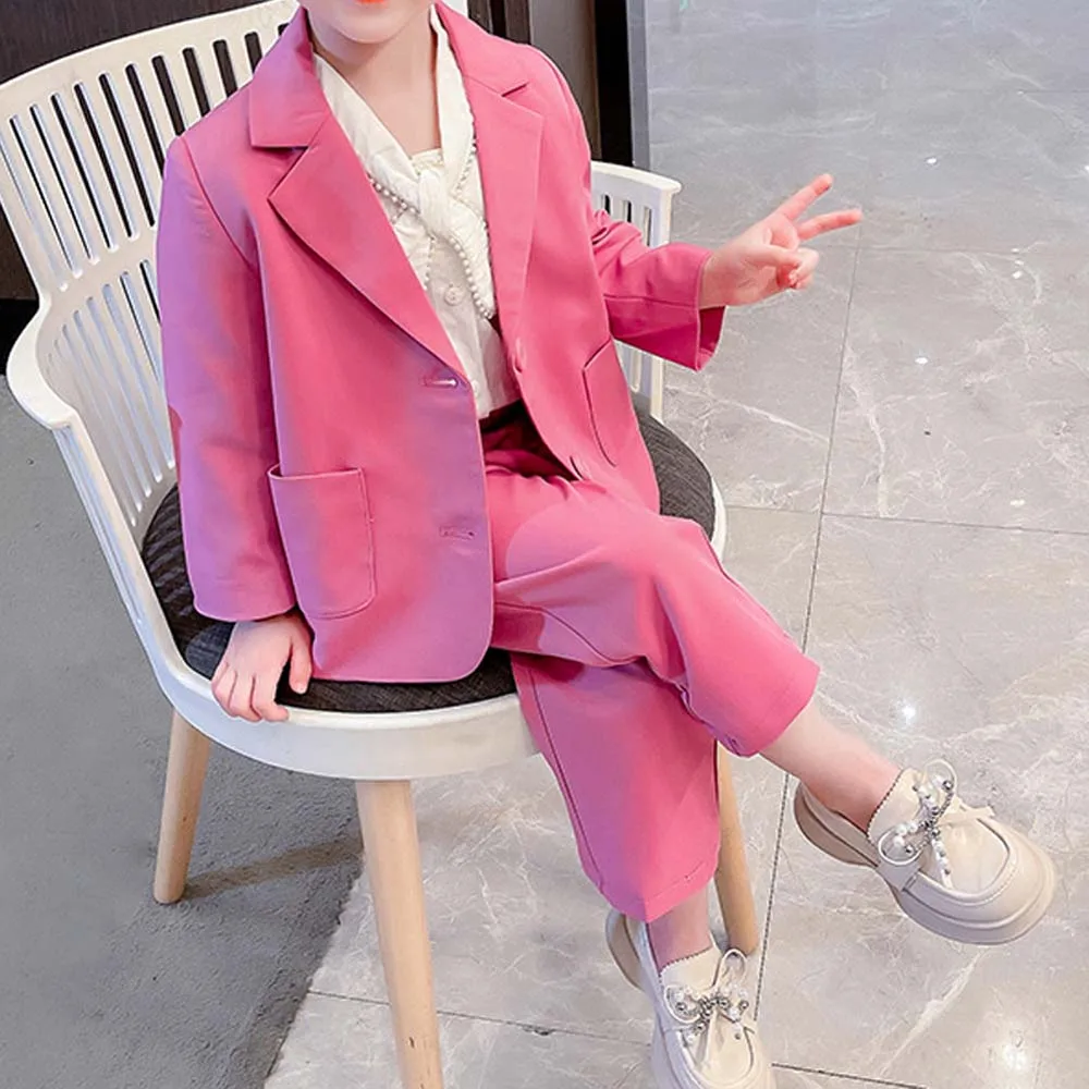 Girls’ Pink Suit Two Piece Set (Jacket+Pants) 2023 New Fashion High Quality Girls’ Elegant Casual Set