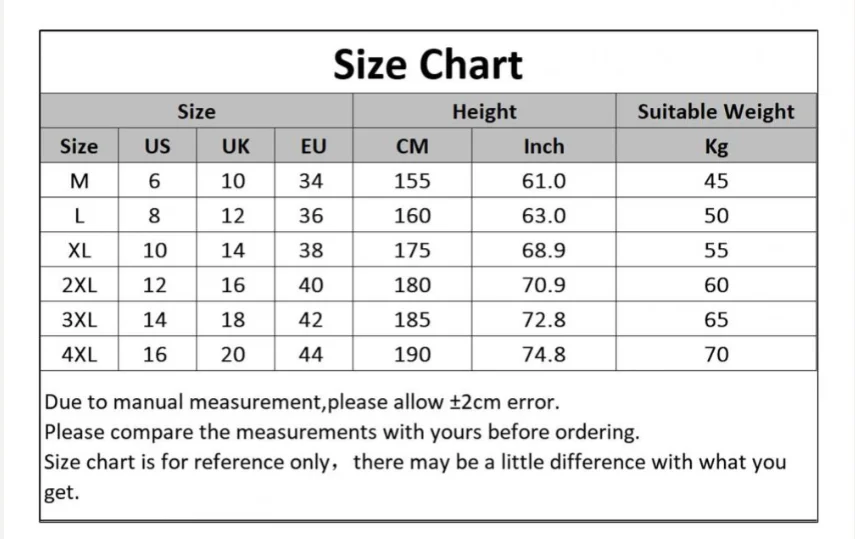 3XL, Suitable Weight: 65kg, Height: 185cm/72.83″ (Approx.)