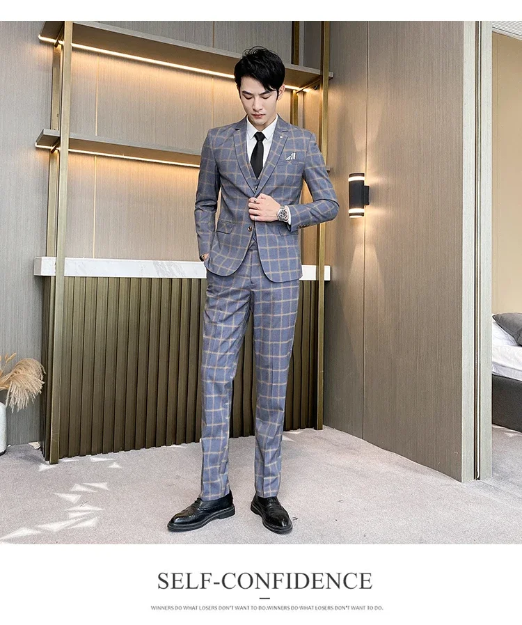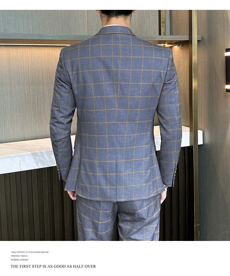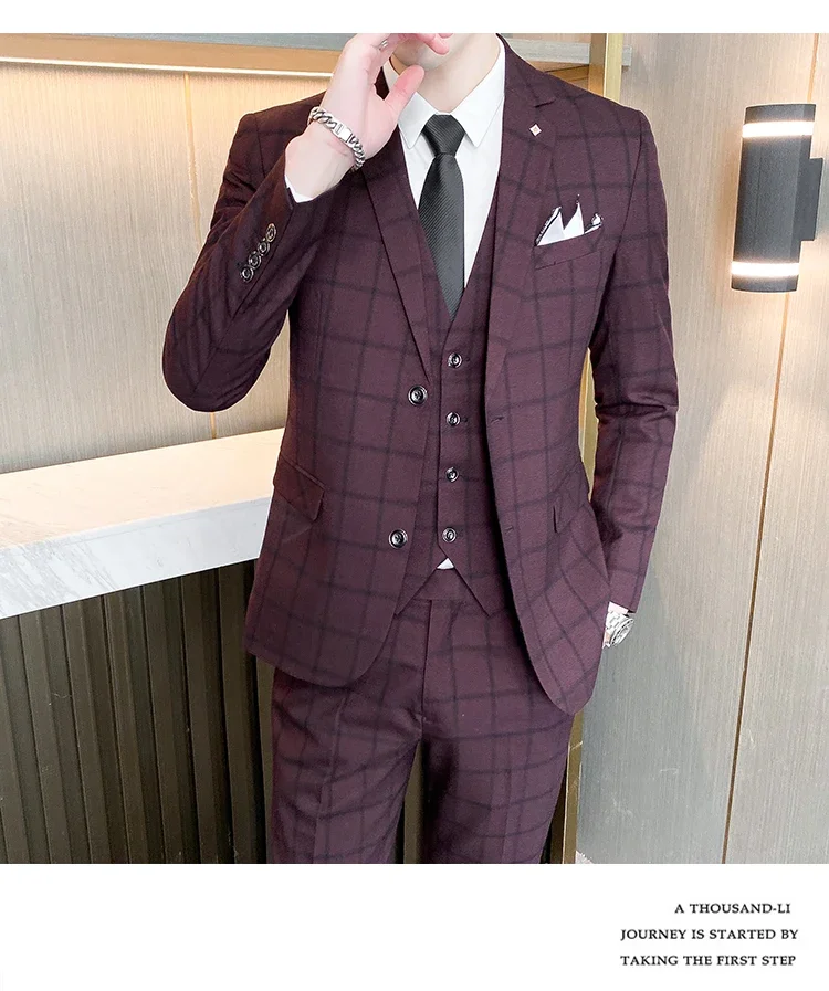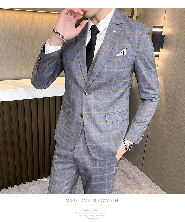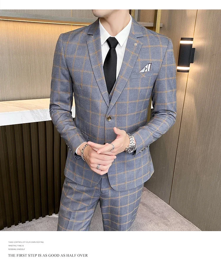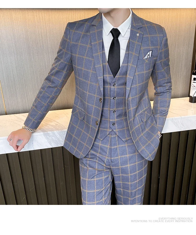 (Jacket+Vest+Pants) Men Dress Suits British 3Piece Men Wedding Suit Autumn Men Business Formal Plaid Suit Male Luxury Slim Dress