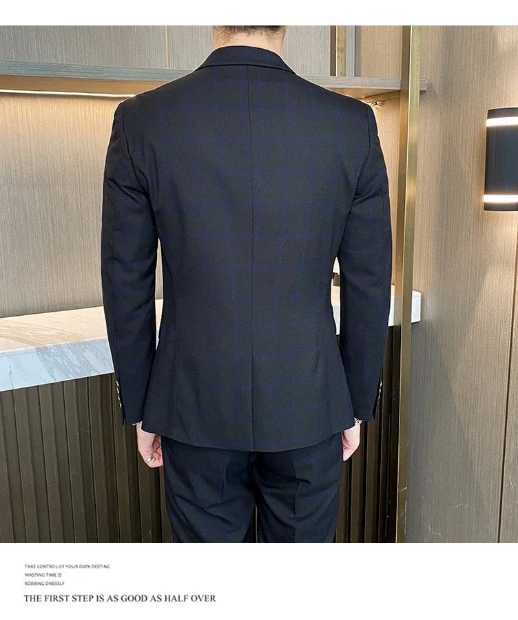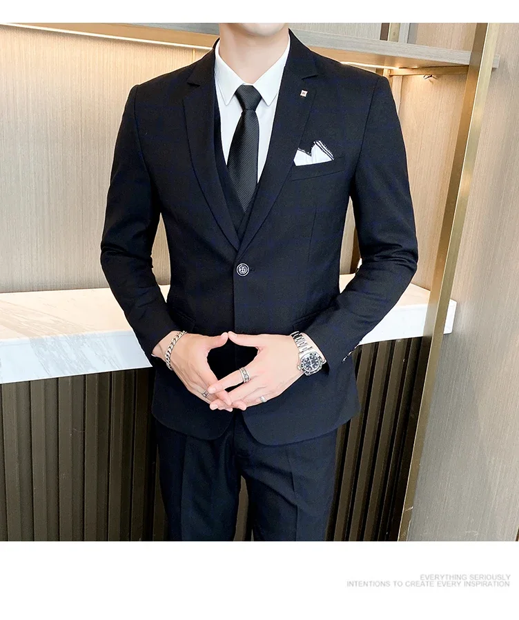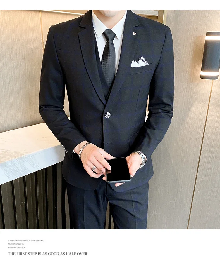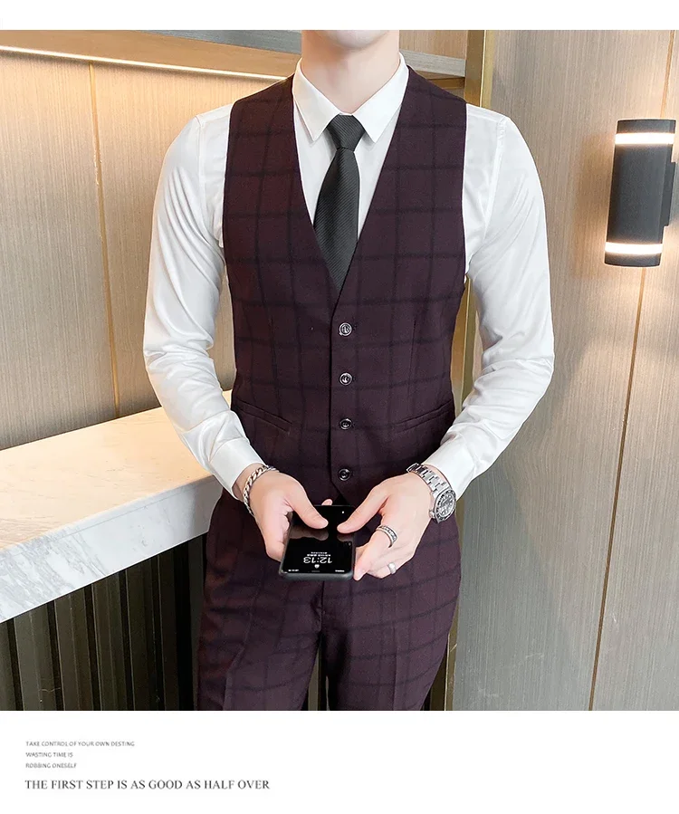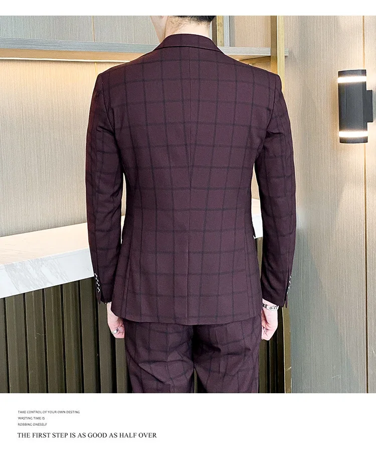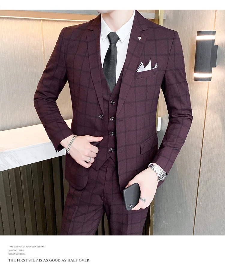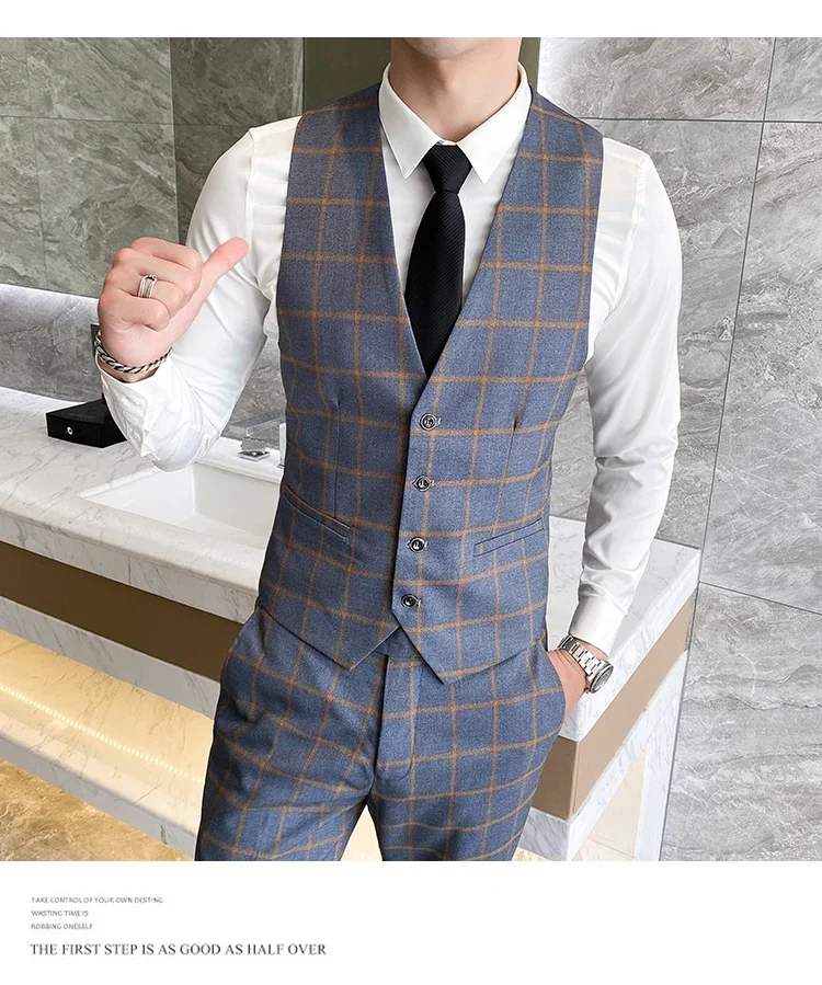 (Jacket+Vest+Pants) Men Dress Suits British 3Piece Men Wedding Suit Autumn Men Business Formal Plaid Suit Male Luxury Slim Dress