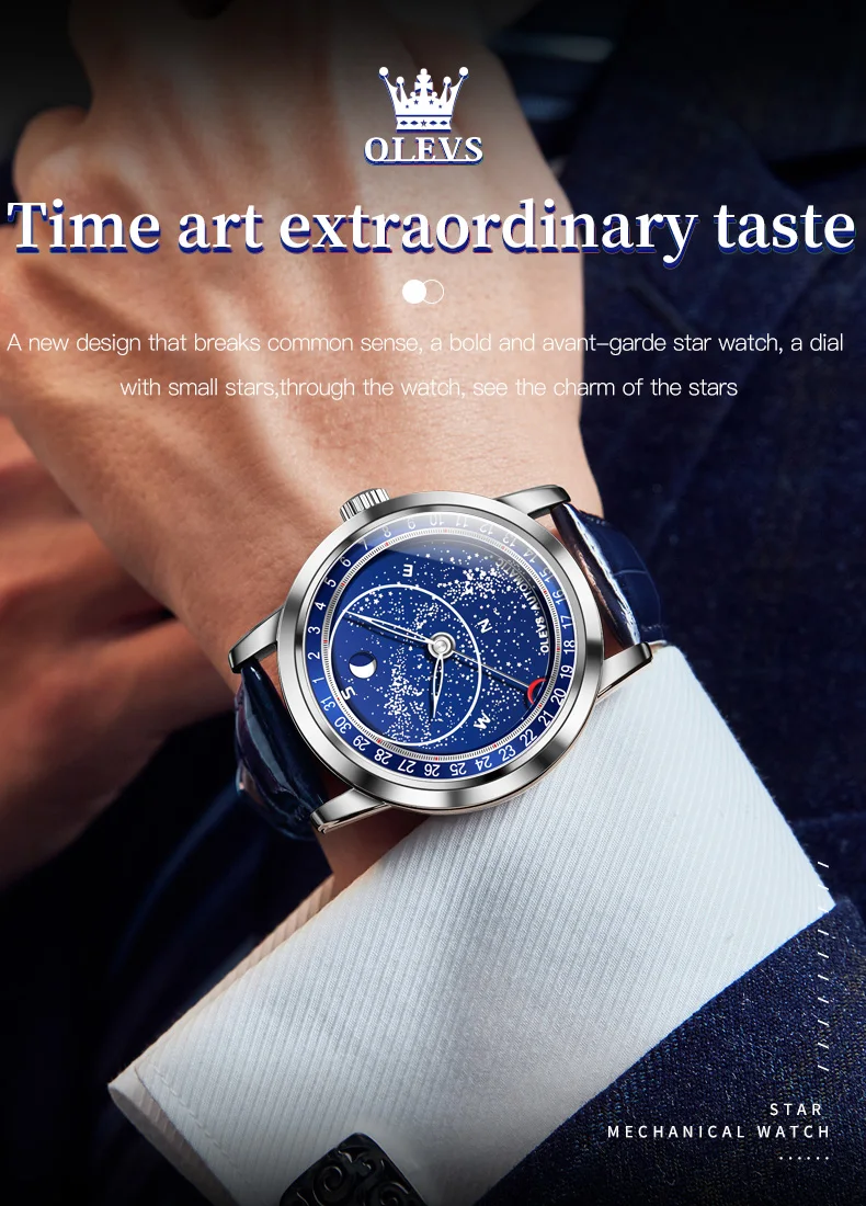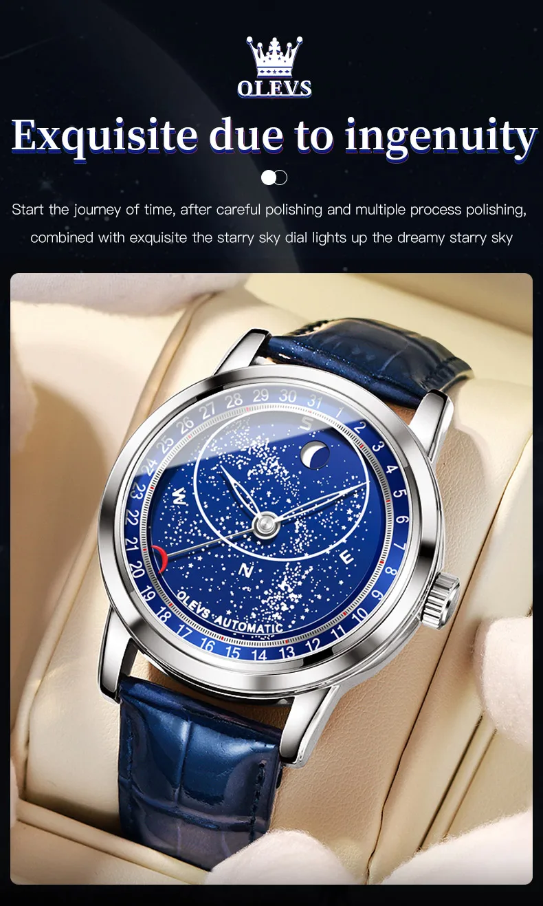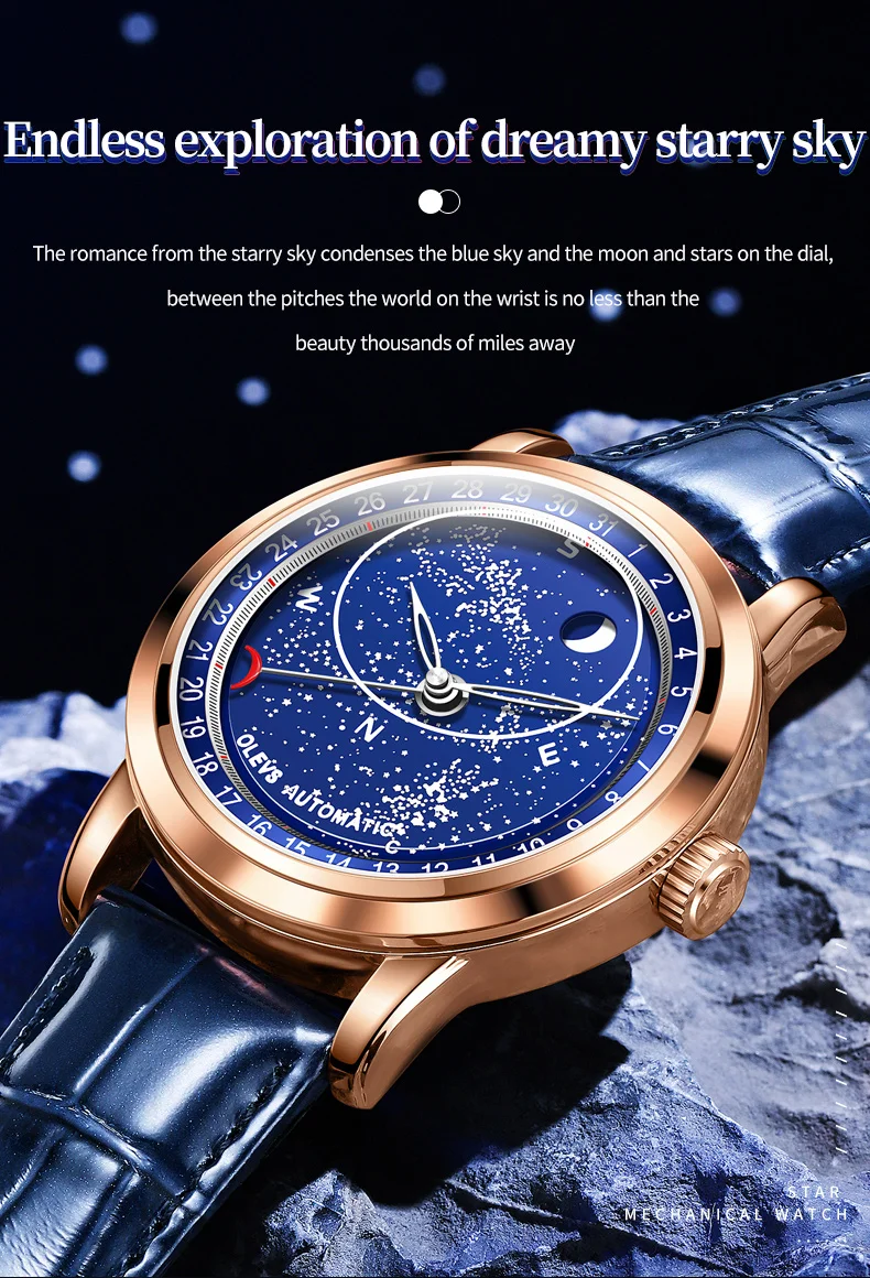• Luxury Dress Watches : We incorporate the blue starry sky that changes at different times into the dial , and the way the moon phase is presented is also different as the date on the outer ring rotates. Create classic and unique designs.