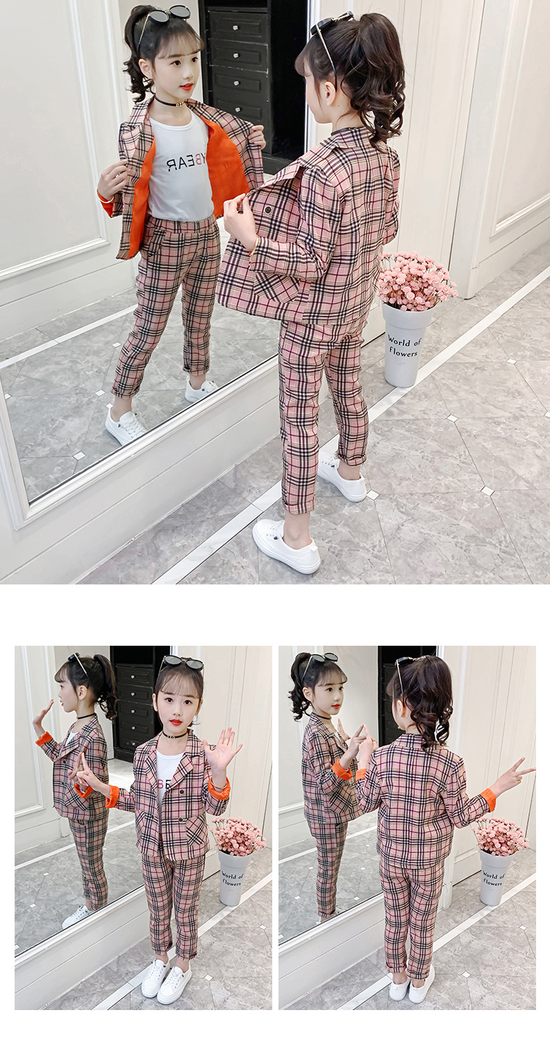 Pink Vintage Plaid Pants Suit Teenage Sexy V-Neck Belt Blazer Coat + Trousers Female Girl 2022 Office Casual Blazer Set 3 9 12 Y