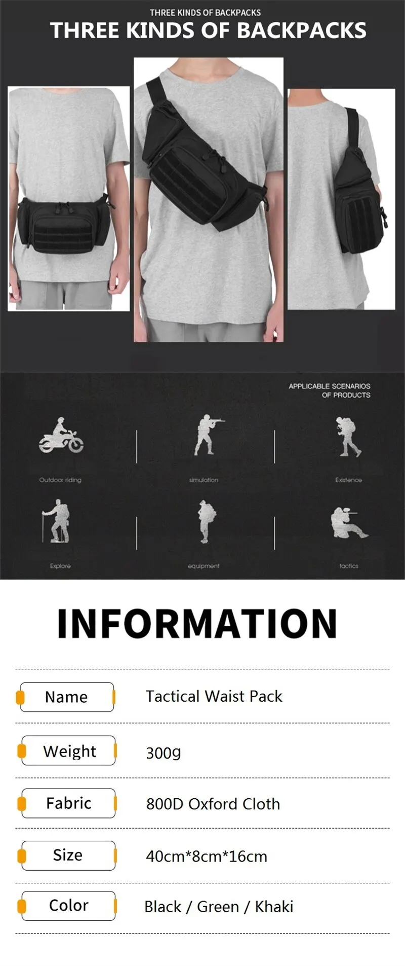 • Tactical Design :The waist pack is designed for tactical use, making it perfect for outdoor activities like hiking, camping, and hunting.