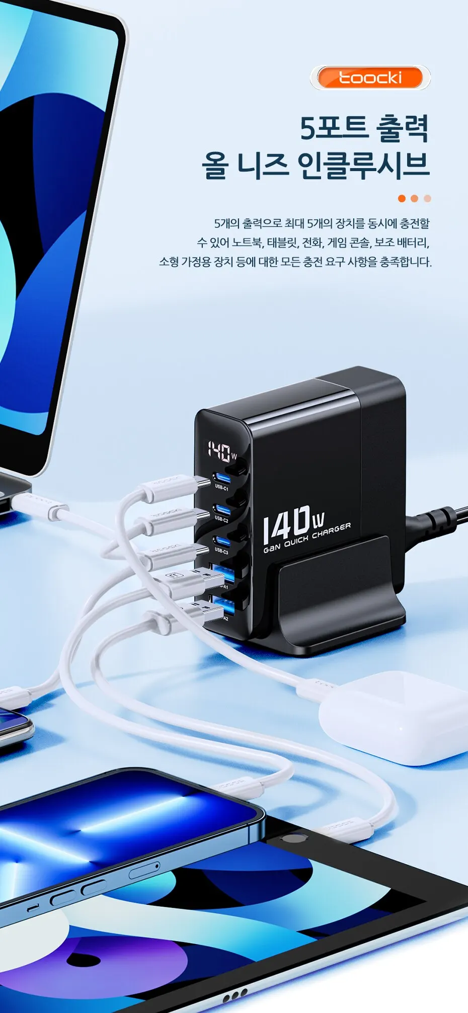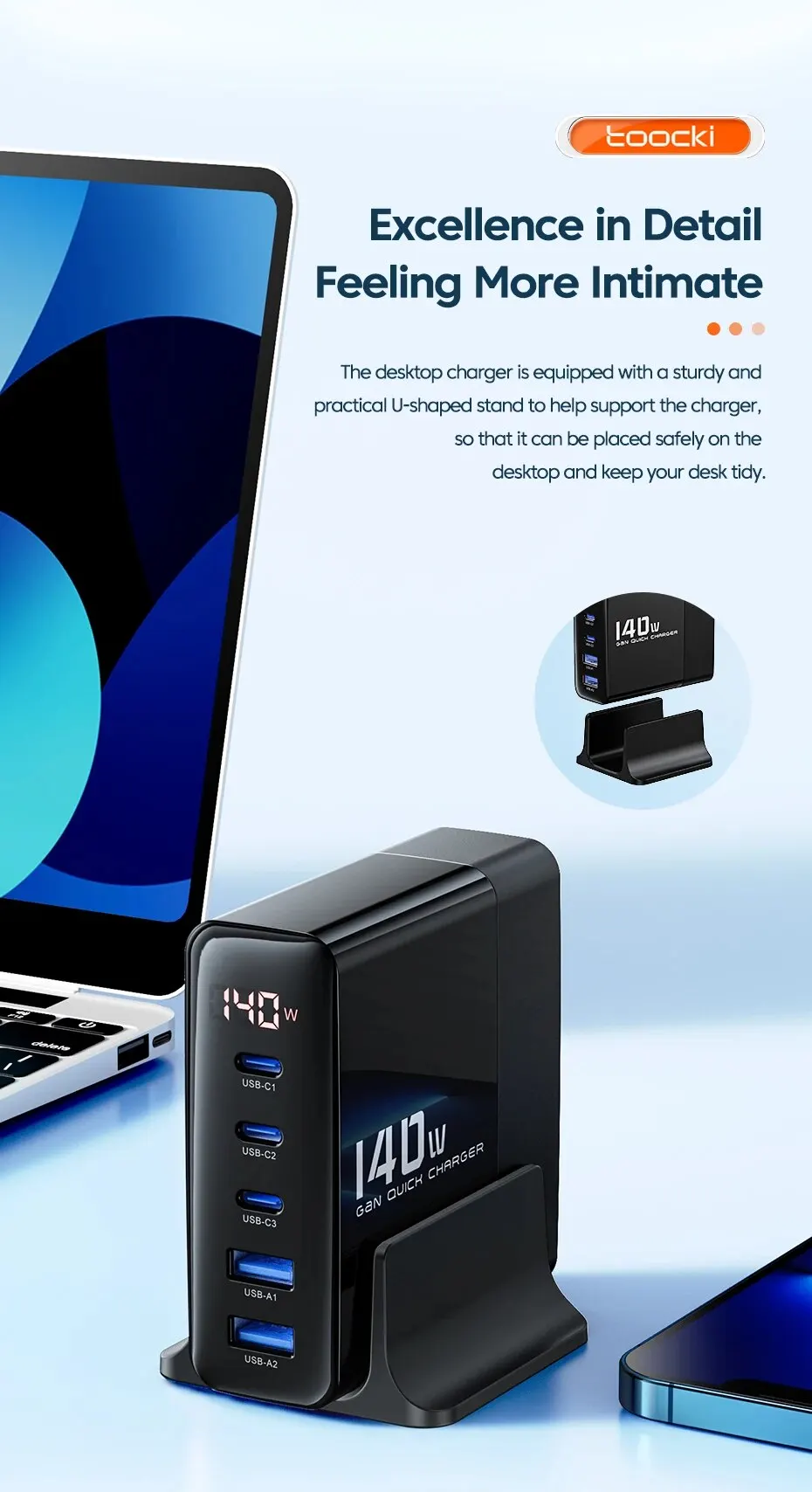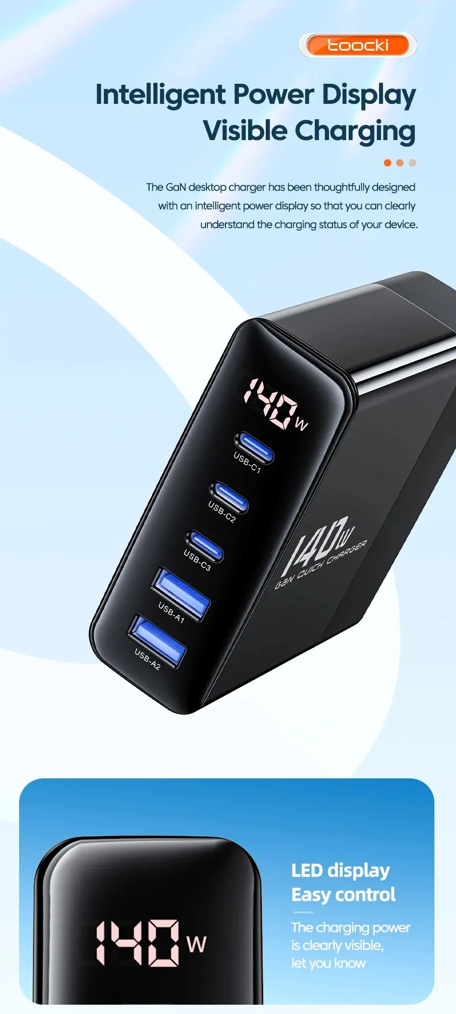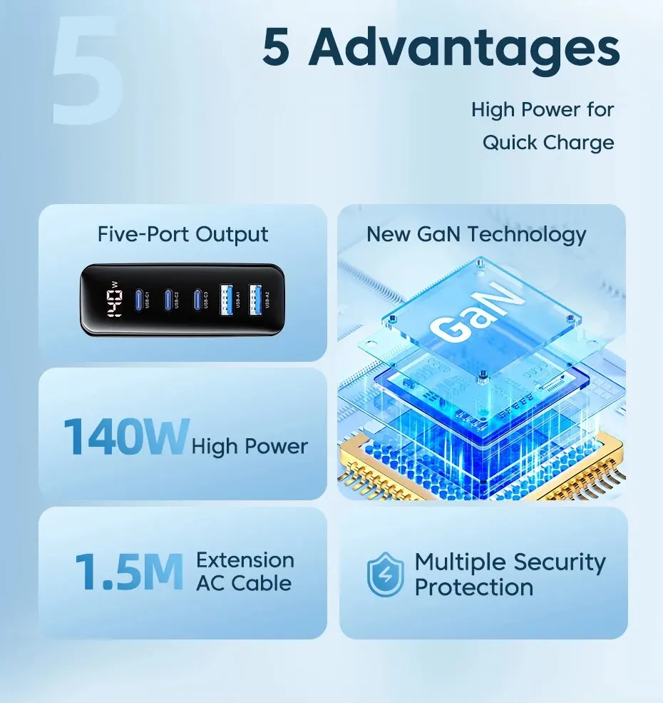 [140W Five-Port OutportDesktop GaN Charger] 140W High Power,Five-Port Output,1.5m Extension AC Cable,New GaN Technology Fully charge for AppleBook Pro in 2 hours Charges for iPhone 13 to 60% in 30 minutes