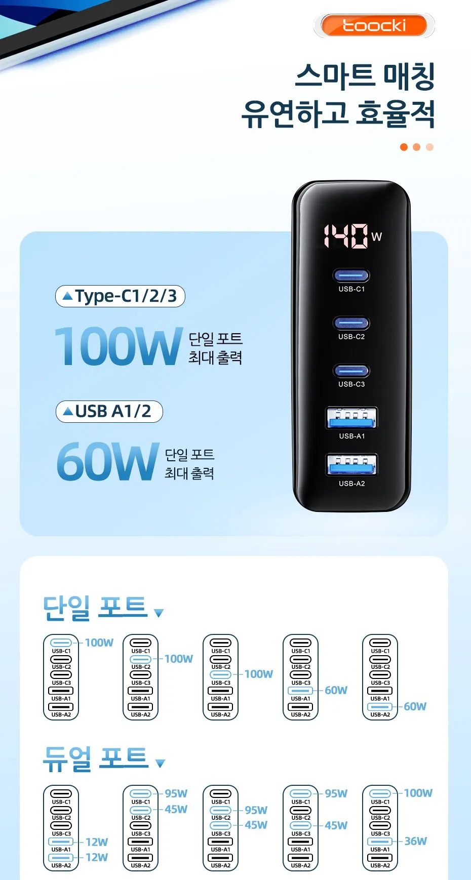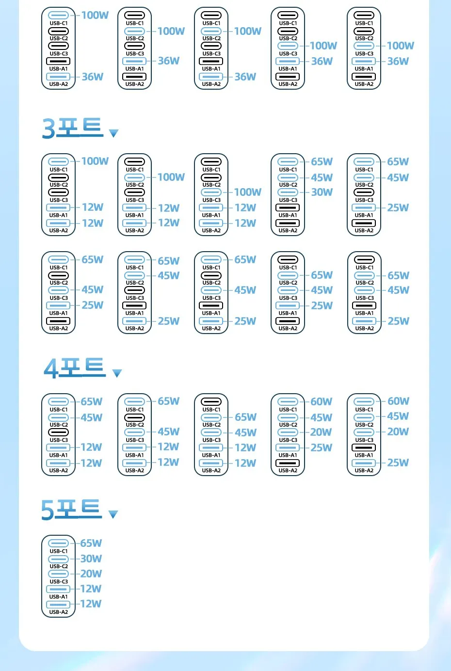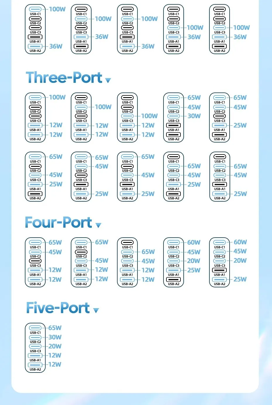 Smart Matching Flexible and Efficient Single Port Type-C1: 100W Type-C2: 100W Type-C3: 100W USB-A1: 60W USB-A2: 60W