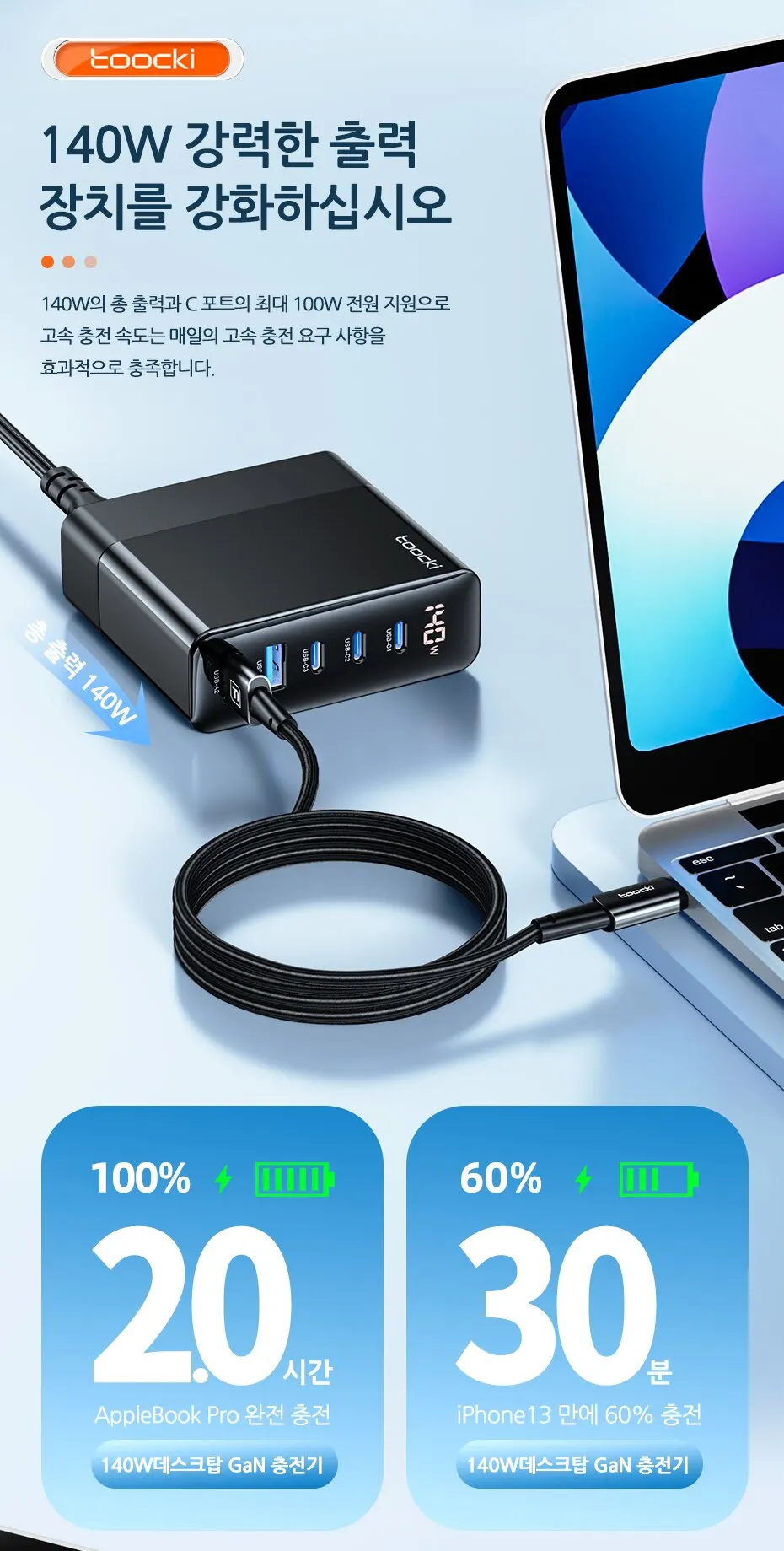 140W Strong Output Empower Your Device With 140W total output and a maximum of 100W power support on the C port, the fast charging speed effectively meets your daily fast charging needs.