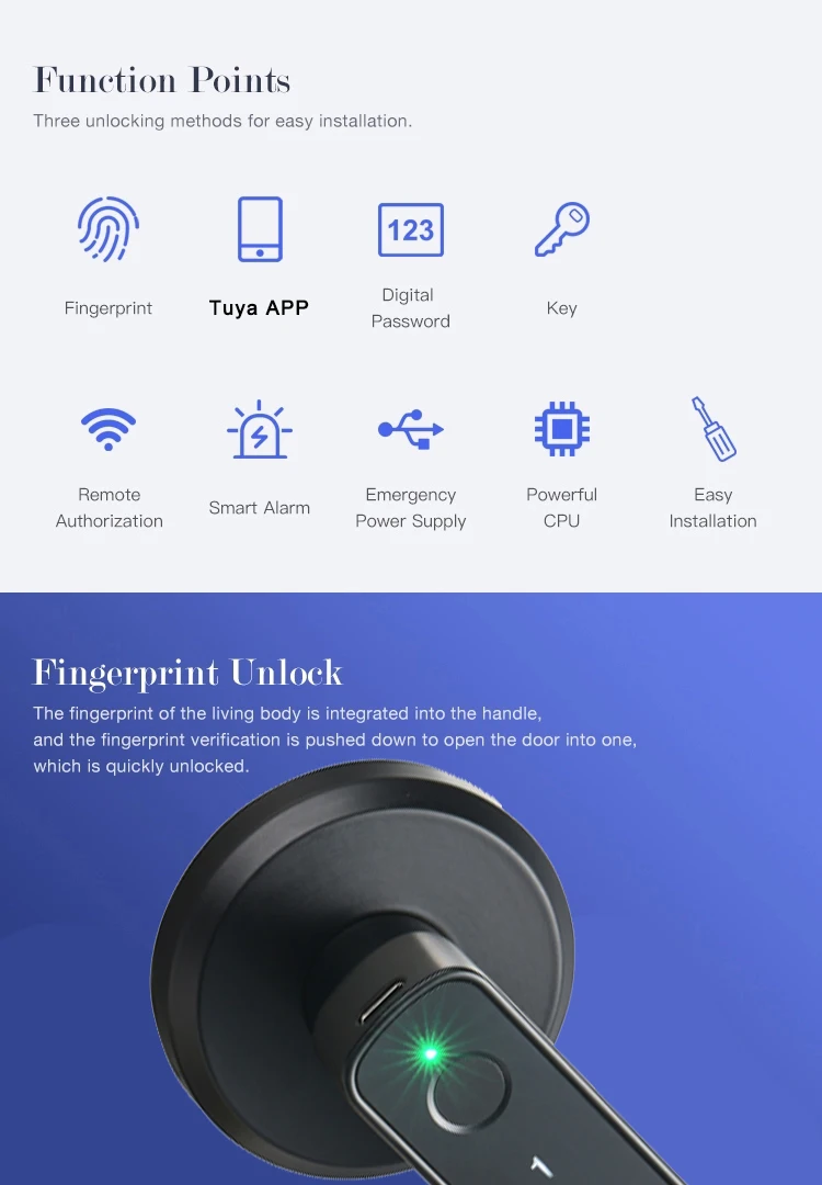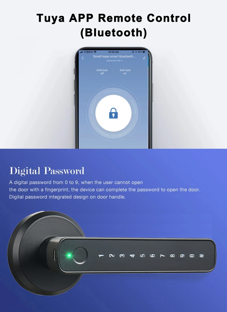 • Unlock mode: Fingerprint / Password/ Mechanical Key (2pcs) / Tuya APP (Bluetooth)