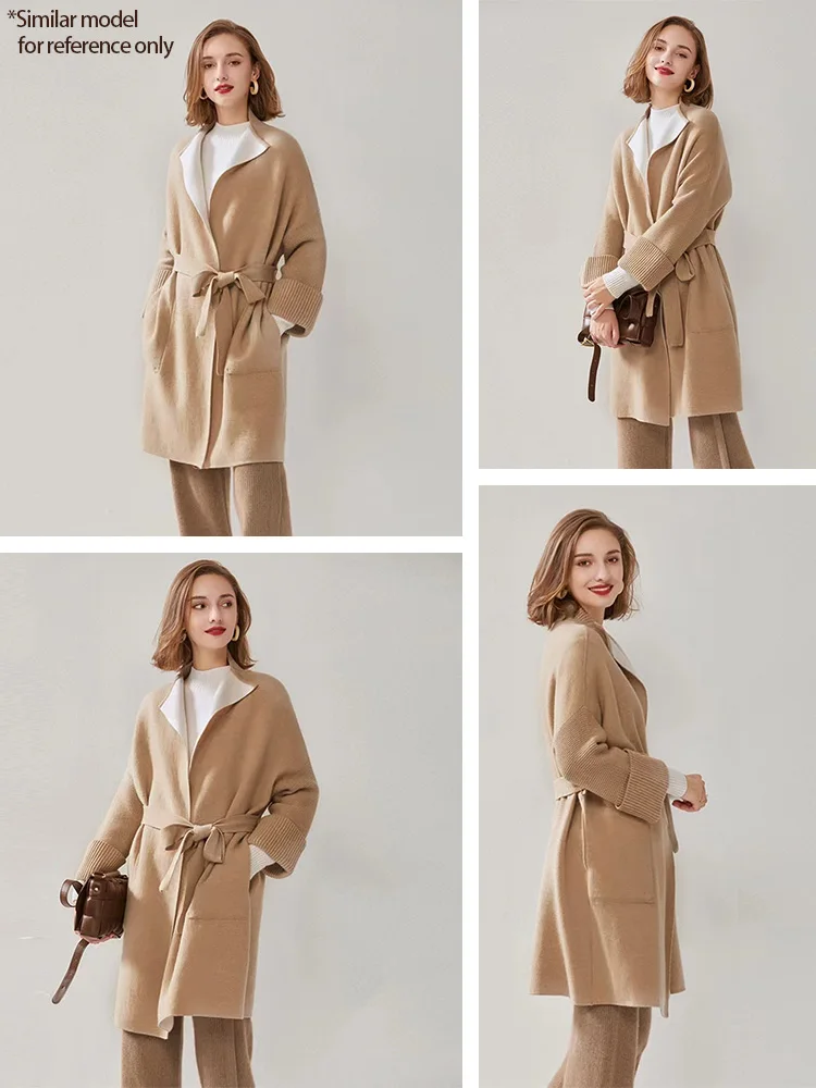 Women Wool Cashmere Long Cardigan Full Needle Knitted Long Robe Coat Belt Open Stitch Loungewear Thick Simple Overcoat Winter